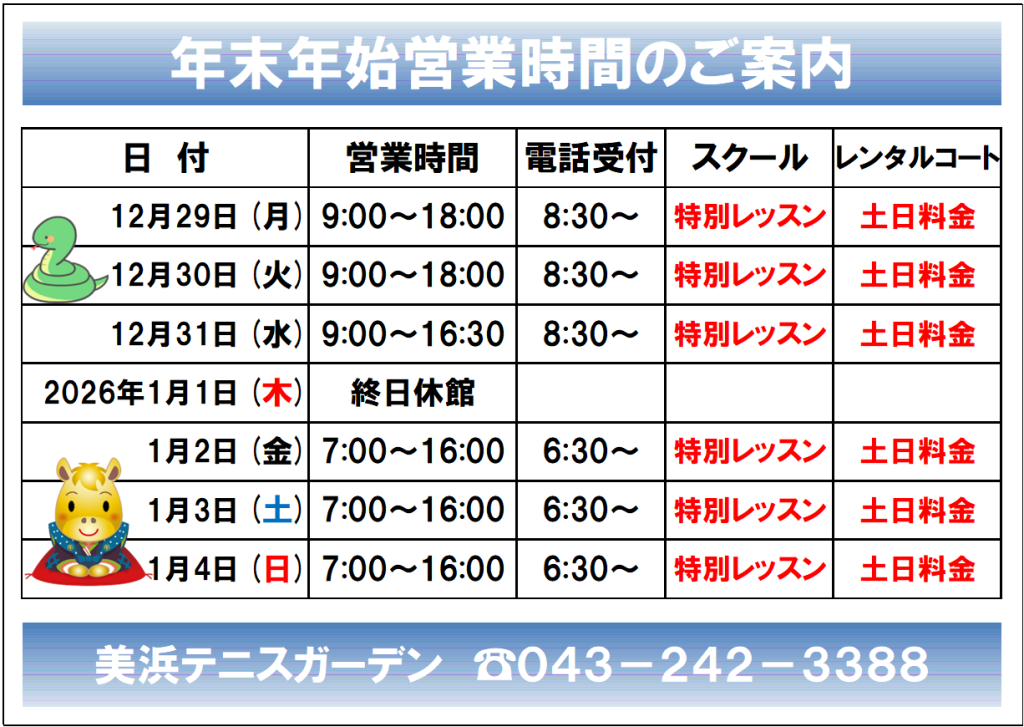 ※コートの利用がない場合、営業時間終了前に閉館する場合もございます。