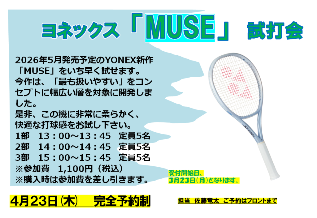 4月23日(木)MUSE試打会を開催します 2026.03.14 YONEX最新ラケットMUSEの試打会を4月23日(木)13:00より開催します。 試打会は完全予約制となり、3月23日(月)より予約受付開始となります。 3月31日(火)は都合により終日休館となります
