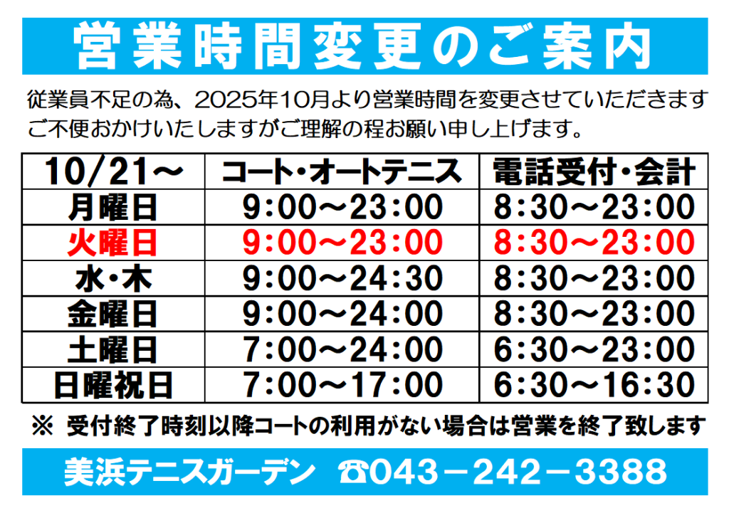 | 特別営業日 | 営業時間 | 電話・受付 | レンタルコート | スクール |